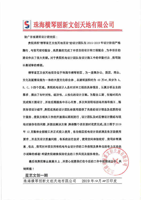 機(jī)電三所以專業(yè)、敬業(yè)的品牌形象贏得客戶信任,近年不斷拓展機(jī)電顧問咨詢業(yè)務(wù),持續(xù)獲得延伸業(yè)務(wù),產(chǎn)值獲獎(jiǎng)雙創(chuàng)新高。在“橫琴星藝文創(chuàng)天地項(xiàng)目”中,來自機(jī)電三所的設(shè)計(jì)團(tuán)隊(duì)在歷時(shí)5年的設(shè)計(jì)過程中,與業(yè)主密切配合,在各項(xiàng)設(shè)計(jì)細(xì)節(jié)和施工指導(dǎo)中精益求精,高質(zhì)量的完成了項(xiàng)目設(shè)計(jì)和現(xiàn)場服務(wù),確保項(xiàng)目按時(shí)優(yōu)質(zhì)完成,獲得業(yè)主高度評價(jià)。