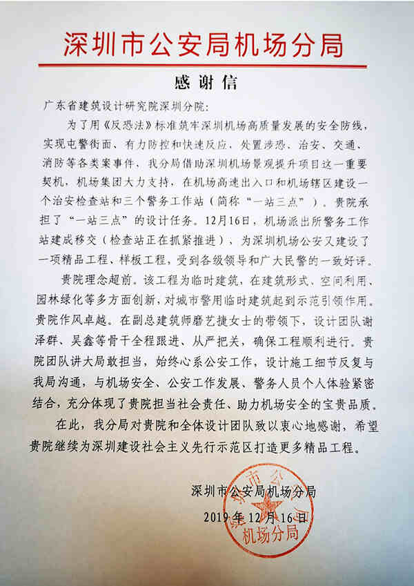 2019年,深圳分院抓住“雙區(qū)驅(qū)動(dòng)”重大戰(zhàn)略機(jī)遇,在鞏固傳統(tǒng)業(yè)務(wù)的基礎(chǔ)上,延伸拓展業(yè)務(wù),積極開展工程總承包、全過程工程咨詢,以及BIM、專業(yè)顧問等新業(yè)務(wù),繼續(xù)做大做強(qiáng)。在“深圳機(jī)場南片區(qū)公共景觀綠化提升工程(設(shè)計(jì))-‘一站三點(diǎn)’”項(xiàng)目中,深圳分院設(shè)計(jì)團(tuán)隊(duì)講大局敢擔(dān)當(dāng),全程跟進(jìn)、從嚴(yán)把關(guān),確保工程順利進(jìn)行,為深圳機(jī)場公安移交了一項(xiàng)精品工程、樣板工程,受到廣泛好評,充分體現(xiàn)了我院擔(dān)當(dāng)社會責(zé)任、助力機(jī)場安全的寶貴品質(zhì)。