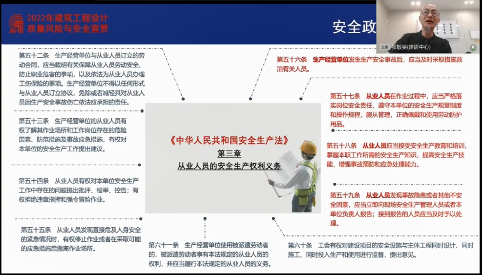 江剛強(qiáng)調(diào)了質(zhì)量安全的重大意義,并結(jié)合公司的實(shí)際工作情況,對(duì)《中華人民共和國安全生產(chǎn)法》和《建設(shè)工程安全生產(chǎn)管理?xiàng)l例》中與設(shè)計(jì)從業(yè)人員相關(guān)的部分條文進(jìn)行了解讀。隨后,幾位主講人分別從各自的專業(yè)角度出發(fā)進(jìn)行了精彩的分享及解析。