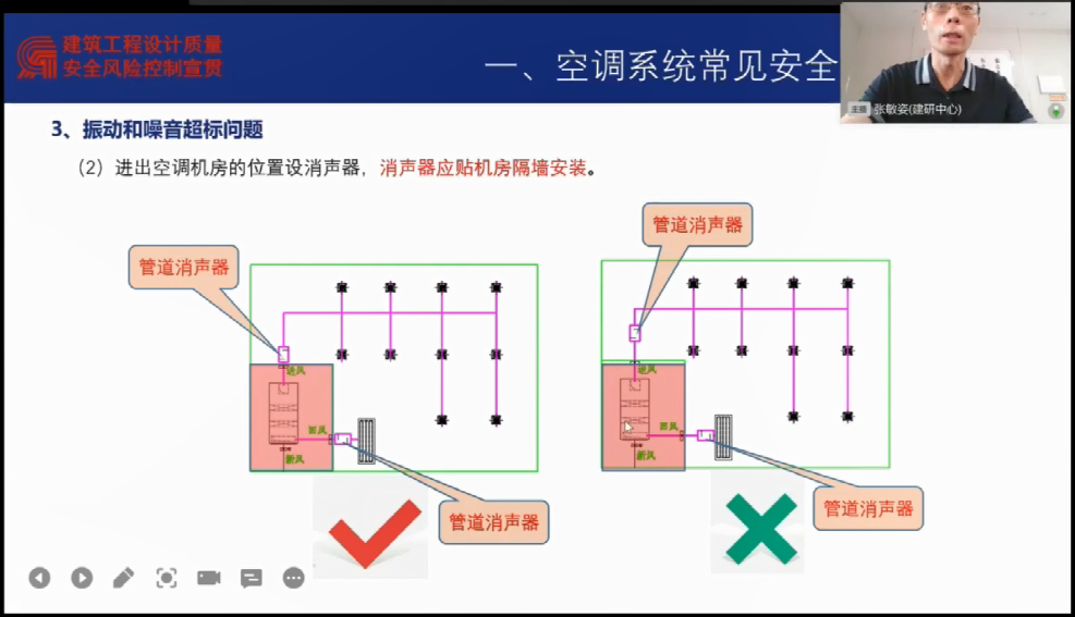機(jī)電三所空調(diào)副總工程師郭林文通過對(duì)空調(diào)系統(tǒng)、防排煙系統(tǒng)和其它專業(yè)配合等方面分析了空調(diào)設(shè)計(jì)中常見的一些安全質(zhì)量問題,比如分體空調(diào)室外機(jī)的位置、新風(fēng)取風(fēng)口的安全和清潔要求、空調(diào)系統(tǒng)設(shè)備振動(dòng)和噪音、荷載較重的設(shè)備及管道設(shè)計(jì)安裝等問題,提醒設(shè)計(jì)人員可以采取合理的措施和方法來避免這些問題的發(fā)生,給客戶提供安全、健康、舒適的室內(nèi)環(huán)境。