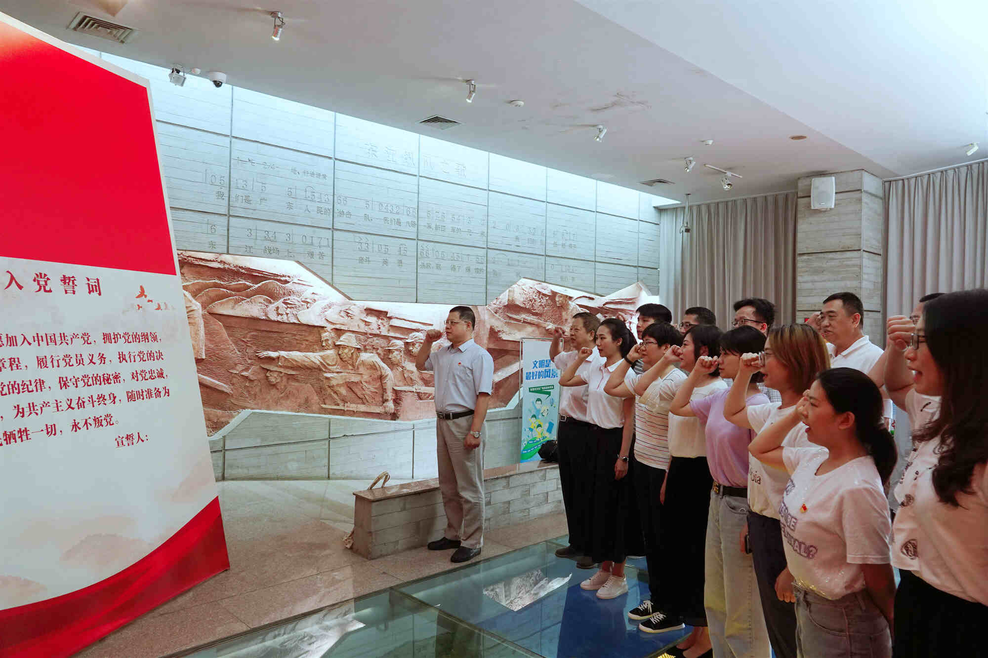 在東江縱隊紀念館,支部黨員首先在黨旗下莊嚴宣誓,重溫入黨誓詞。在王業(yè)綱書記的領(lǐng)學下,黨員參觀了7個主題展廳,學習了東江縱隊在槍林彈雨的戰(zhàn)爭年代,孤懸敵后、堅持抗戰(zhàn)的英雄事跡,感悟革命先烈不怕犧牲、英勇奮戰(zhàn)的革命精神。
