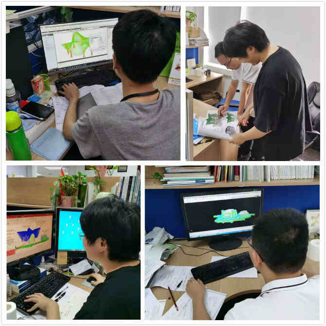 巨大的壓力沒有讓久經(jīng)沙場(chǎng)的項(xiàng)目組成員沮喪,反而激發(fā)了他們的斗志。支部書記蔣運(yùn)林鼓勵(lì)創(chuàng)崗黨員:“要像齒輪一樣緊密配合,共同推進(jìn)工作往前趕”。大家還不熟悉工作要點(diǎn)怎么辦?賴?guó)櫫?、吳桂廣兩位同志挺身而出,對(duì)項(xiàng)目進(jìn)行細(xì)致的討論分析,確定了大跨度馬鞍形網(wǎng)殼的穩(wěn)定分析、預(yù)應(yīng)力索網(wǎng)與鋼桁架的找形分析等重點(diǎn)難點(diǎn),并如同庖丁解牛般將復(fù)雜的項(xiàng)目分解成各子項(xiàng)任務(wù),對(duì)項(xiàng)目組成員詳細(xì)溝通講解,使全體成員均清晰了解項(xiàng)目的特點(diǎn)以及自身的工作任務(wù),為超限分析工作有條不紊地開展打下了堅(jiān)實(shí)的基礎(chǔ)。