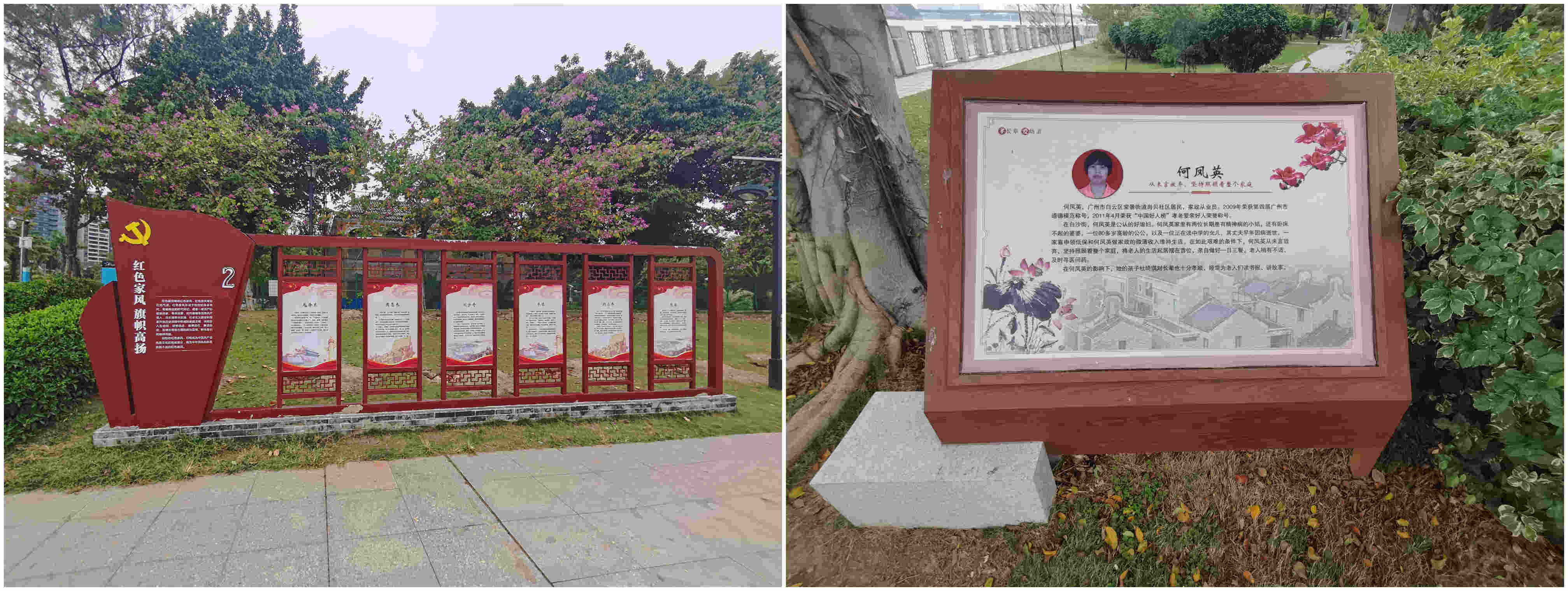 該公園為廣州市首家家風(fēng)家訓(xùn)主題公園,以廣州“十大好家風(fēng)”為設(shè)計(jì)主線(xiàn),將家風(fēng)文化內(nèi)容、嶺南歷史人文與公園景觀園林設(shè)計(jì)有機(jī)融合,做到一步一景一知識(shí),集觀賞、休閑、展覽和愛(ài)國(guó)主義教育于一體。